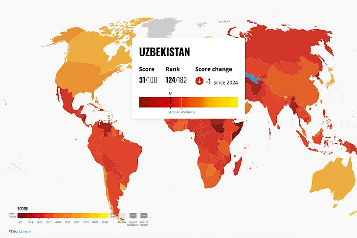 Uzbekistan has fallen to 124th place, scoring 31 points in the 2025 Corruption Perceptions Index (CPI). These results were published in the annual report by the international organization Transparency International, Gazeta.uz reports.